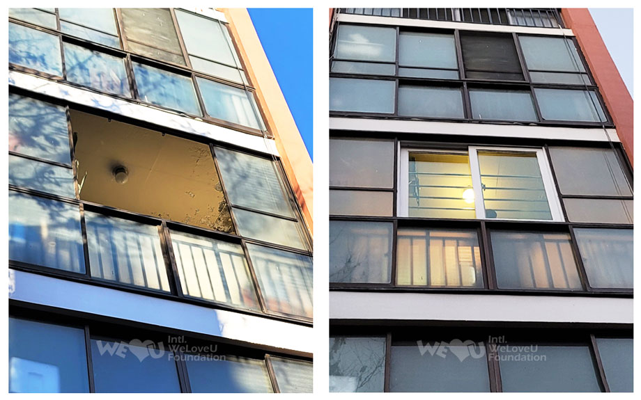 “When I was cleaning my balcony, the window was blown away because of strong wind. There was nothing I could do. I’ve just lived without a window. However, now it is too cold in winter without a window. There is a lot of mold in my son’s room. I tried to clean it, but it was too much. I’m worried about my son’s health because of that.”