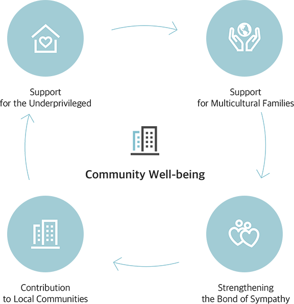 We strive for the well-being of disadvantaged people such as children, senior citizens, women, and the disabled. We share family-like love with them by supporting welfare institutions with goods and volunteer services, and we promote communication and harmony among community members by helping farmers, holding charity concerts, participating in community work, and volunteering as supporters for domestic or international sports games.
