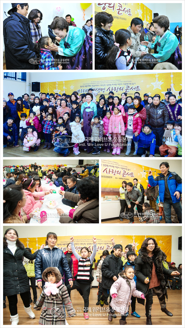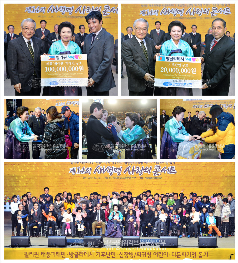 The Intl. WeLoveU Foundation has been conveying love to the whole world with the heart of a mother every year. On December 15, about two weeks before the New Year’s Day, the Foundation held the 14th New Life Concert at the Jamsil Student Gymnasium in Seoul, Korea, to give love and hope to neighbors in need both inside and outside Korea—victims of Typhoon Haiyan in the Philippines, climate refugees in Bangladesh, children with heart or rare diseases, and multicultural families, etc.