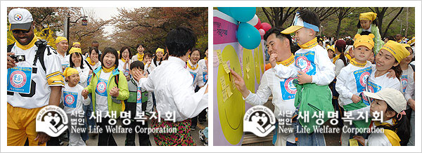 The New Life Welfare Foundation held the 8th New Life Walkathon to deliver new life and hope to children suffering from heart disease, rare diseases and intractable diseases. As society becomes industrialized, people lose their smiles gradually. So the walkathon was planned as citizens’ festival to restore their smiles and make happier family and better society. It was sponsored by Ministry of Health and Welfare, Commission on Youth Protection, and Korea Association for the Prevention of Child Abuse Network [KAPCAN]. Over 10,000 members participated including 70 families with twin children. The figures of various social standings also joined the event: Lee Myeong-bak the Mayor of Seoul Metropolitan City, Choi Yeong-hee the Chief of the Commission on Youth Protection, Yi Bae-keun the Principal of Korea Youth Counseling Institute, Yang Gyeong-ja the Chairwoman of Seoul Social Welfare Council, Kim No-bo the Chairman of Save the Children Korea, Lee Soon-jae the Sponsor Chairman of the New Life Welfare Foundation and so on.