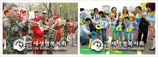 At the Baek-bum Plaza the destination, lively music of the brass band, which consisted of the US army band and the New Life Welfare Foundation band, greeted the participants. The university student volunteers, who belonged to the foundation, prepared ten events; at a booth named the “Message of Hope,” the members delivered hope to the children suffering from diseases with the words like “Don’t give up though you’re sick. Cheer up!”; at a booth named “Carnation Messenger,” children wrote some words of thanks for their parents on a ribbon and gave it to their parents with a carnation; at a booth named “Balloon Art,” the student volunteers made a hat, a flower or a stick with a balloon for children; at a booth of “Old Days’ Games,” the adult participants were reminiscent of their childhood, playing slap-match game and eating sugar biscuit that they ate when they were young. All the families had a great time.