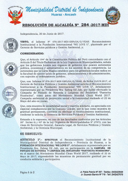 Hoạt động thể này làm tấm gương cho tinh thần đoàn kết và cổ xúy nghi thức xã hội. Chúng tôi nhận xét đây là niềm tự hào đặc biệt của Ủy ban quận Independencia, và quý đoàn thể là đối tượng đáng phải nhận cảm tạ một cách liên tục, và chúng tôi đáng phải bày tỏ ý cảm tạ theo yêu cầu của Cục trưởng Cục Quản lý Môi trường Dịch vụ Công cộng.