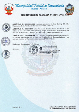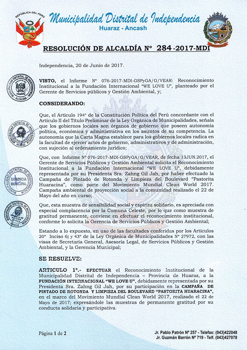 Hạng 1: Ủy ban quận Independencia ở Huaraz bày tỏ ý cảm tạ một cách chính thức đối với Chủ tịch Zahng Gil Jah Quỹ WeLoveU Quốc tế đã tiến hành Chiến dịch làm sạch và quét sơn đại lộ Pastorita Huaraina vào ngày 22 tháng 5 năm 2017, là một phần của Vận động Clean WORLD khắp thế giới năm 2017 và cổ xúy sự tham gia và đoàn kết.