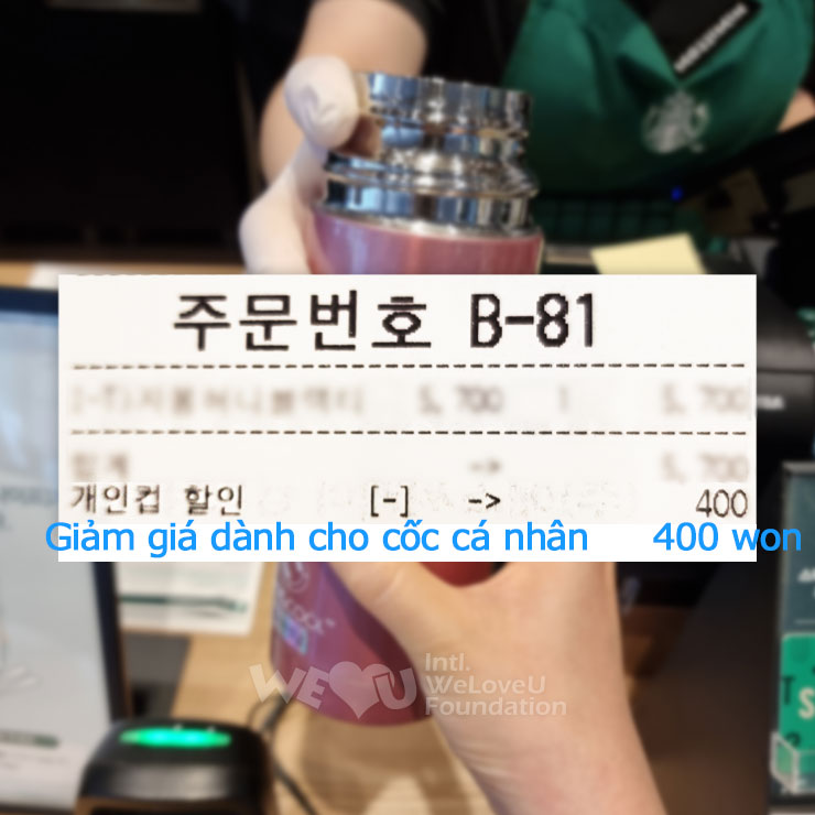 Mỗi khi đi mua đồ uống, tôi thường dùng bình giữ nhiệt hoặc cốc cá nhân. Một quán cà phê đã giảm giá rất lớn là 400 won cho việc sử dụng cốc cá nhân. Thậm chí còn đảm bảo vệ sinh vì có thể tự mình rửa sạch nên thật là nhất cử lưỡng tiện.