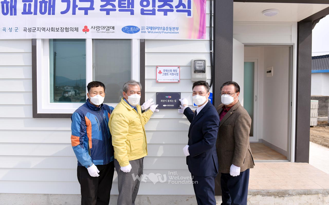 Ngày 24 tháng 2, lễ hoàn công kiêm lễ vào ở được tổ chức ở trước nhà mới. Ngoài các nhân viên Tổ chức WeLoveU, Chủ tịch huyện Gokseong-gun Yoo Geun Ki, Chủ tịch Ủy ban Gokseong-gun Jeonnam Jeong In Qyun, Chủ tịch Hội gây quỹ Cộng đồng Phúc lợi Xã hội Jeonnam No Dong Il, và Trưởng thôn Shin-ri Lee Yun Hee cũng tham dự. Vào ngày này, Tổ chức WeLoveU đã trao tặng thêm TV, bộ chăn đệm và bộ bát đĩa cho gia đình được hỗ trợ. Một tấm biển ghi dòng chữ “Ngôi nhà nở hoa hy vọng” cũng được trao tặng để thể hiện mong muốn của các hội viên mong ngôi nhà mới là một tổ ấm ấm áp và tràn ngập tiếng cười.
