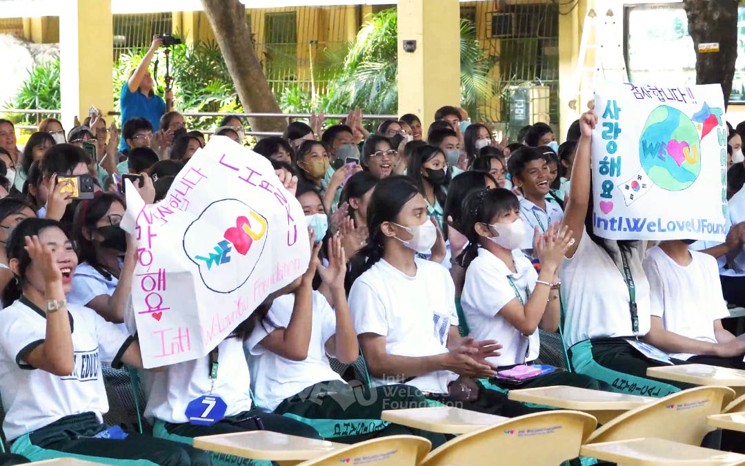 “Xin cảm ơn WeLoveuU. Chúng tôi yêu các quý vị.” Các học sinh ở Trường THPT Quốc gia Las Piñas, Philippines vừa cổ vũ, vừa vẫy những tấm thiệp được viết bằng tiếng Hàn.