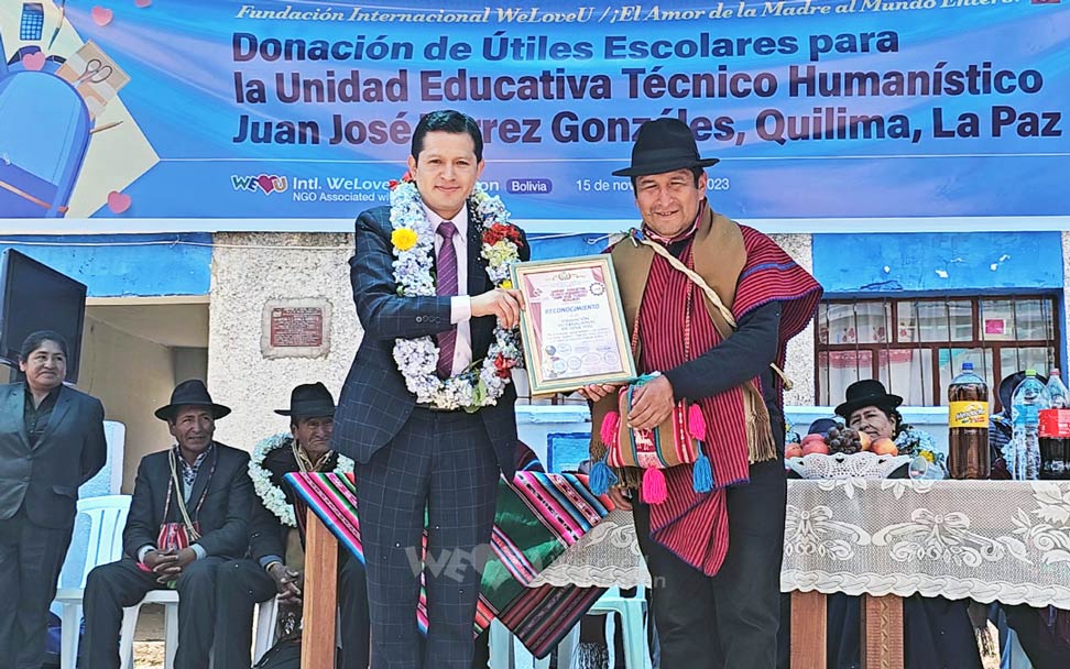 Sở Giáo dục Puerto Carabuco đã gửi bản cảm tạ đến Chủ tịch danh dự Zahng Gil Jah và Tổ chức WeLoveU; phu nhân Phó Tổng thống Bolivia đã tham dự buổi lễ cũng khen ngợi và ủng hộ các hoạt động của WeLoveU.