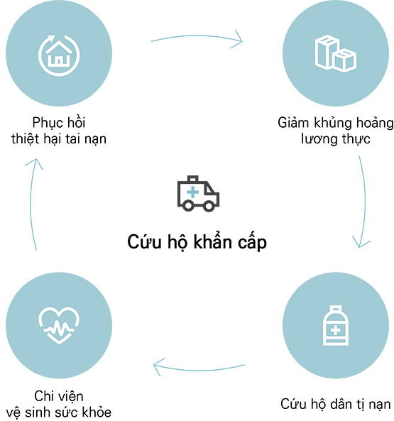Thảm họa lớn bất ngờ làm cho cuộc sống của một người bị sụp đổ hoàn toàn và thậm chí phá hủy nền tảng xã hội của một quốc gia. Chúng tôi tổ chức hoạt động cứu hộ khẩn cấp cho dân tị nạn bị uy hiếp sự sống do các cuộc chiến tranh và nội chiến xảy ra bởi các vấn đề chủng tộc & dân tộc & tôn giáo & quốc tịch & chính trị và sự hỗn loạn về kinh tế & xã hội, và cho dân tị nạn vì khí hậu & các nạn nhân bị mất nhà cửa và sinh kế do thảm họa môi trường, động đất và nạn đói.