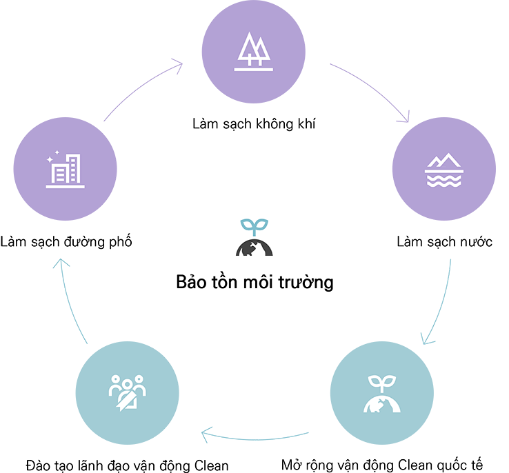 Không khí ô nhiễm gây ảnh hưởng xấu không chỉ cho cơ quan hô hấp mà còn cho mọi cơ quan của thân thể, rốt cuộc uy hiếp sự sinh tồn. Thông qua hoạt động Clean Air, chúng tôi làm sạch không khí ô nhiễm ở núi, công viên, đường phố v.v… và bảo tồn không khí sạch sẽ.