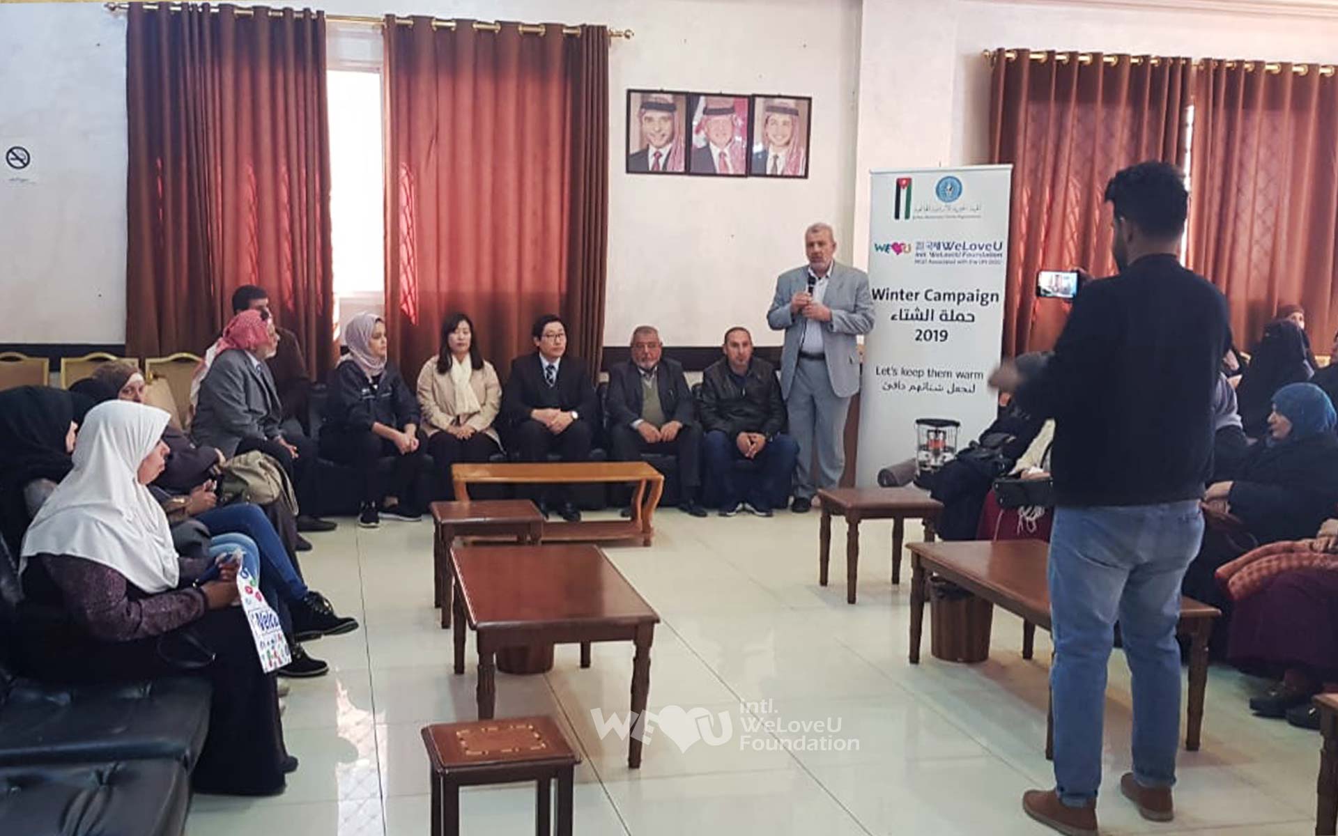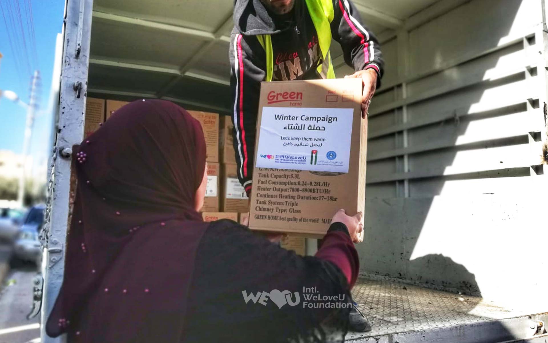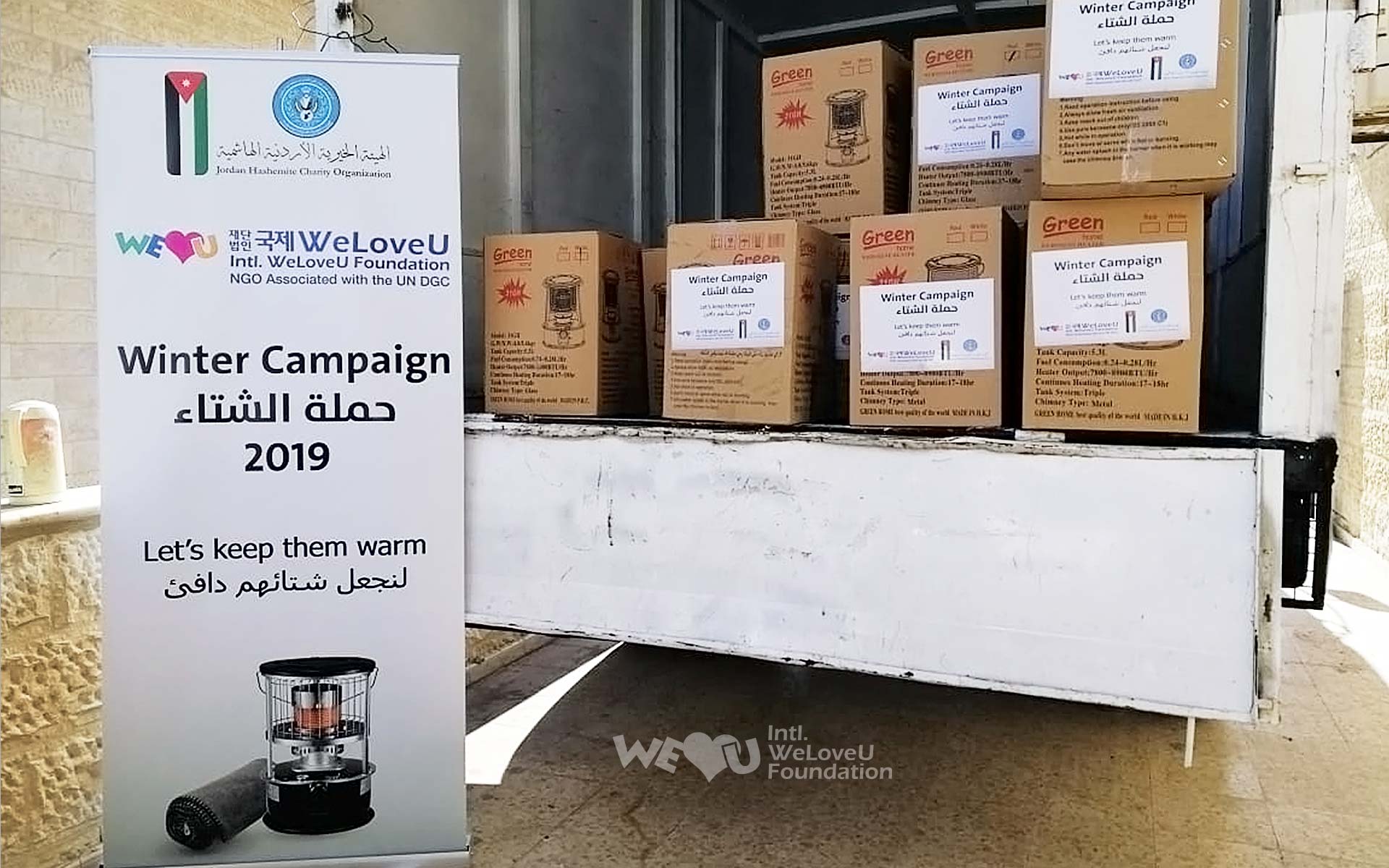 Vào ngày 27 tháng 11, Tổ chức WeLoveU đã gửi quỹ quyên góp trị giá 20.000 đô la Mỹ cho JHCO để người dân Jordan có một mùa đông ấm áp, và sau đó JHCO đã mua sắm hàng viện trợ bằng quỹ quyên góp này. Vào ngày 18 tháng 12, lễ trao tặng sản phẩm sưởi ấm đã được tổ chức tại Hiệp hội từ thiện Aqraba ở thủ đô Amman. Vào ngày này, Giám đốc đại diện Tổ chức WeLoveU chi nhánh Jordan và các quan chức JHCO đã trao tặng cho 83 gia đình dân tị nạn Syria và 55 gia đình nhóm yếu thế sống ở Amman, mỗi gia đình 1 máy sưởi ấm dầu và 2 cái chăn.