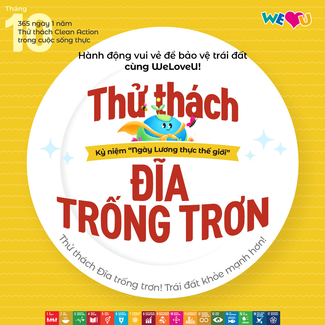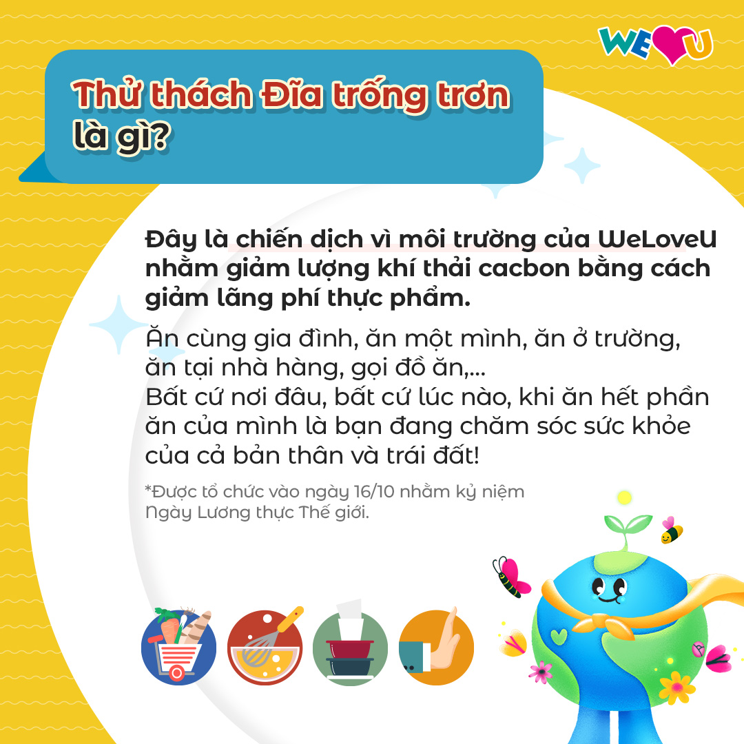 Trong tháng 10, WeLoveU đã tiến hành “Thử thách sạch bát sạch đĩa” nhằm giảm lượng khí thải cácbon do lãng phí thực phẩm gây ra. Thử thách có ý nghĩa là không vứt đi chút thực phẩm nào bằng cách ăn hết mọi đồ ăn trong bát đĩa.